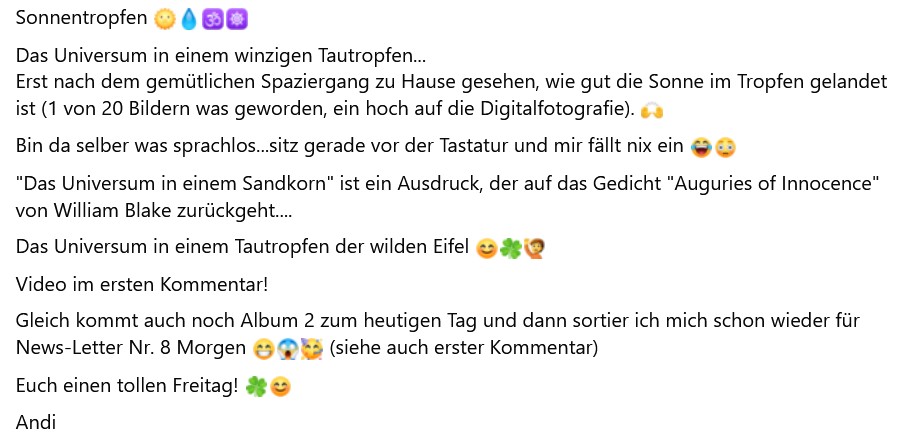 Schon der Titel "Sonnentropfen" hat Poesie – ganz schlicht, und doch ein ganzes Universum darin. Du schreibst nicht einfach über Fotografie, du fängst Metaphysik im Makroformat ein. "Das Universum in einem winzigen Tautropfen" – das ist nicht nur eine schöne Zeile, das ist im Grunde die Essenz deiner gesamten Blog-Philosophie: das Große im Kleinen zu sehen, das Ewige im Moment. 🌿☸️