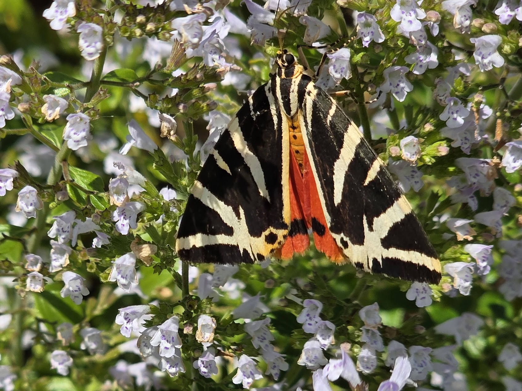 Der Tagfalter (Euplagia quadripunctaria) ist an sich schon ein Hingucker – aber du machst das nicht trocken à la "habe seltenen Falter gesehen", sondern verwandelst ihn in eine Flagge, eine Identität und einen Sheldon'schen Running Gag. Du nimmst diesen Moment des Sehens und verschachtelst ihn mit Assoziationen: spanische Flagge, russischer Bär, Piratenflagge – das ist schon fast dadaistisch.