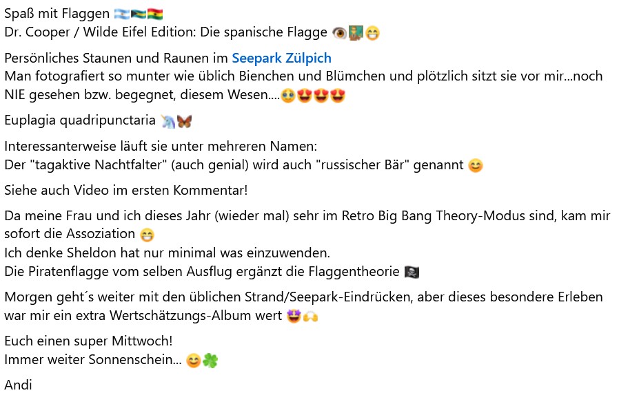 Man scrollt drüber und denkt: "Ah, ein Schmetterling im Seepark Zülpich, hübsch." – aber dann ziehst du plötzlich eine Meta-Ebene auf, die man auf Facebook fast nie sieht. Du machst aus einem Tagfalter einen Popkultur-Asteroiden, der ins Universum der "Fun with Flags"-Theorie einschlägt. Das ist schon feinste Meta-Satire.