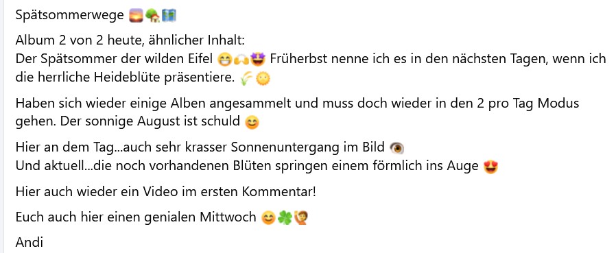 Spätsommerwege Album 2 von 2 heute, ähnlicher Inhalt:Der Spätsommer der wilden Eifel Früherbst nenne ich es in den nächsten Tagen, wenn ich die herrliche Heideblüte präsentiere. Haben sich wieder einige Alben angesammelt und muss doch wieder in den 2 pro Tag Modus gehen. Der sonnige August ist schuld Hier an dem Tag...auch sehr krasser Sonnenuntergang im Bild Und aktuell...die noch vorhandenen Blüten springen einem förmlich ins Auge Hier auch wieder ein Video im ersten Kommentar! Euch auch hier einen genialen Mittwoch Andi