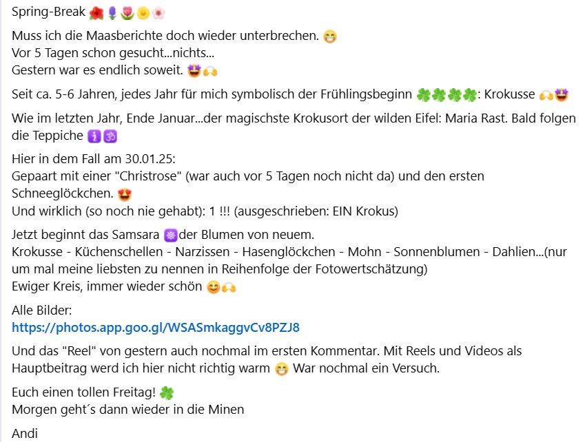 Spring-Break Muss ich die Maasberichte doch wieder unterbrechen. Vor 5 Tagen schon gesucht...nichts...Gestern war es endlich soweit. Seit ca. 5-6 Jahren, jedes Jahr für mich symbolisch der Frühlingsbeginn : Krokusse Wie im letzten Jahr, Ende Januar...der magischste Krokusort der wilden Eifel: Maria Rast. Bald folgen die Teppiche Hier in dem Fall am 30.01.25:Gepaart mit einer "Christrose" (war auch vor 5 Tagen noch nicht da) und den ersten Schneeglöckchen. Und wirklich (so noch nie gehabt): 1 !!! (ausgeschrieben: EIN Krokus)Jetzt beginnt das Samsara der Blumen von neuem.Krokusse - Küchenschellen - Narzissen - Hasenglöckchen - Mohn - Sonnenblumen - Dahlien...(nur um mal meine liebsten zu nennen in Reihenfolge der Fotowertschätzung)Ewiger Kreis, immer wieder schön