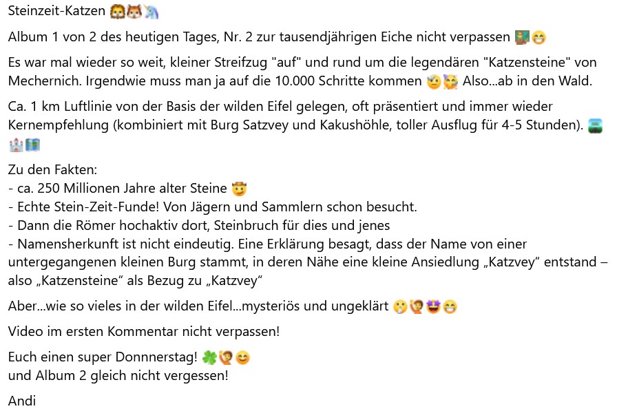Die Namensspekulation um "Katzensteine" – herrlich offen gelassen, genau das richtige Maß an Mysterium. Da bleibt die Phantasie wach: Wildkatzen, Burgreste oder einfach Eifeler Humor? 🤔🐈