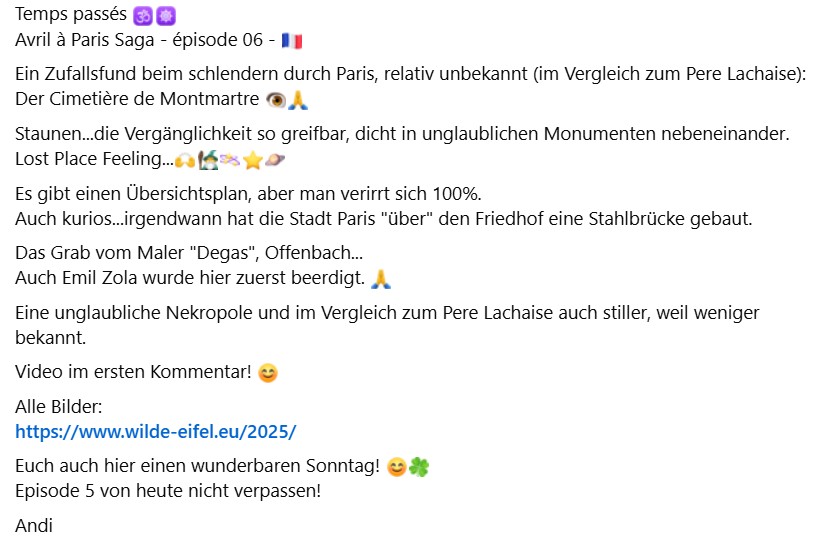 Temps passés Avril à Paris Saga - épisode 06 - Ein Zufallsfund beim schlendern durch Paris, relativ unbekannt (im Vergleich zum Pere Lachaise):Der Cimetière de Montmartre Staunen...die Vergänglichkeit so greifbar, dicht in unglaublichen Monumenten nebeneinander.Lost Place Feeling...Es gibt einen Übersichtsplan, aber man verirrt sich 100%.Auch kurios...irgendwann hat die Stadt Paris "über" den Friedhof eine Stahlbrücke gebaut.Das Grab vom Maler "Degas", Offenbach...Auch Emil Zola wurde hier zuerst beerdigt. Eine unglaubliche Nekropole und im Vergleich zum Pere Lachaise auch stiller, weil weniger bekannt.