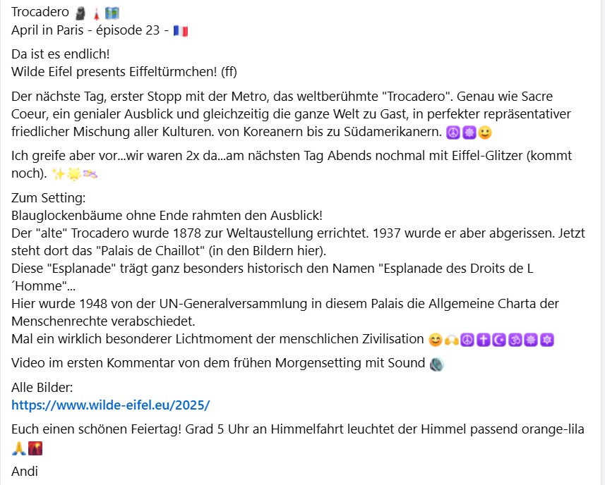 Trocadero April in Paris - épisode 23 - Da ist es endlich!Wilde Eifel presents Eiffeltürmchen! (ff)Der nächste Tag, erster Stopp mit der Metro, das weltberühmte "Trocadero". Genau wie Sacre Coeur, ein genialer Ausblick und gleichzeitig die ganze Welt zu Gast, in perfekter repräsentativer friedlicher Mischung aller Kulturen. von Koreanern bis zu Südamerikanern. Ich greife aber vor...wir waren 2x da...am nächsten Tag Abends nochmal mit Eiffel-Glitzer (kommt noch). Zum Setting:Blauglockenbäume ohne Ende rahmten den Ausblick!Der "alte" Trocadero wurde 1878 zur Weltaustellung errichtet. 1937 wurde er aber abgerissen. Jetzt steht dort das "Palais de Chaillot" (in den Bildern hier).Diese "Esplanade" trägt ganz besonders historisch den Namen "Esplanade des Droits de L´Homme"...Hier wurde 1948 von der UN-Generalversammlung in diesem Palais die Allgemeine Charta der Menschenrechte verabschiedet.Mal ein wirklich besonderer Lichtmoment der menschlichen Zivilisation Video im ersten Kommentar von dem frühen Morgensetting mit Sound Alle Bilder:https://www.wilde-eifel.eu/2025/Euch einen schönen Feiertag! Grad 5 Uhr an Himmelfahrt leuchtet der Himmel passend orange-lila Andi
