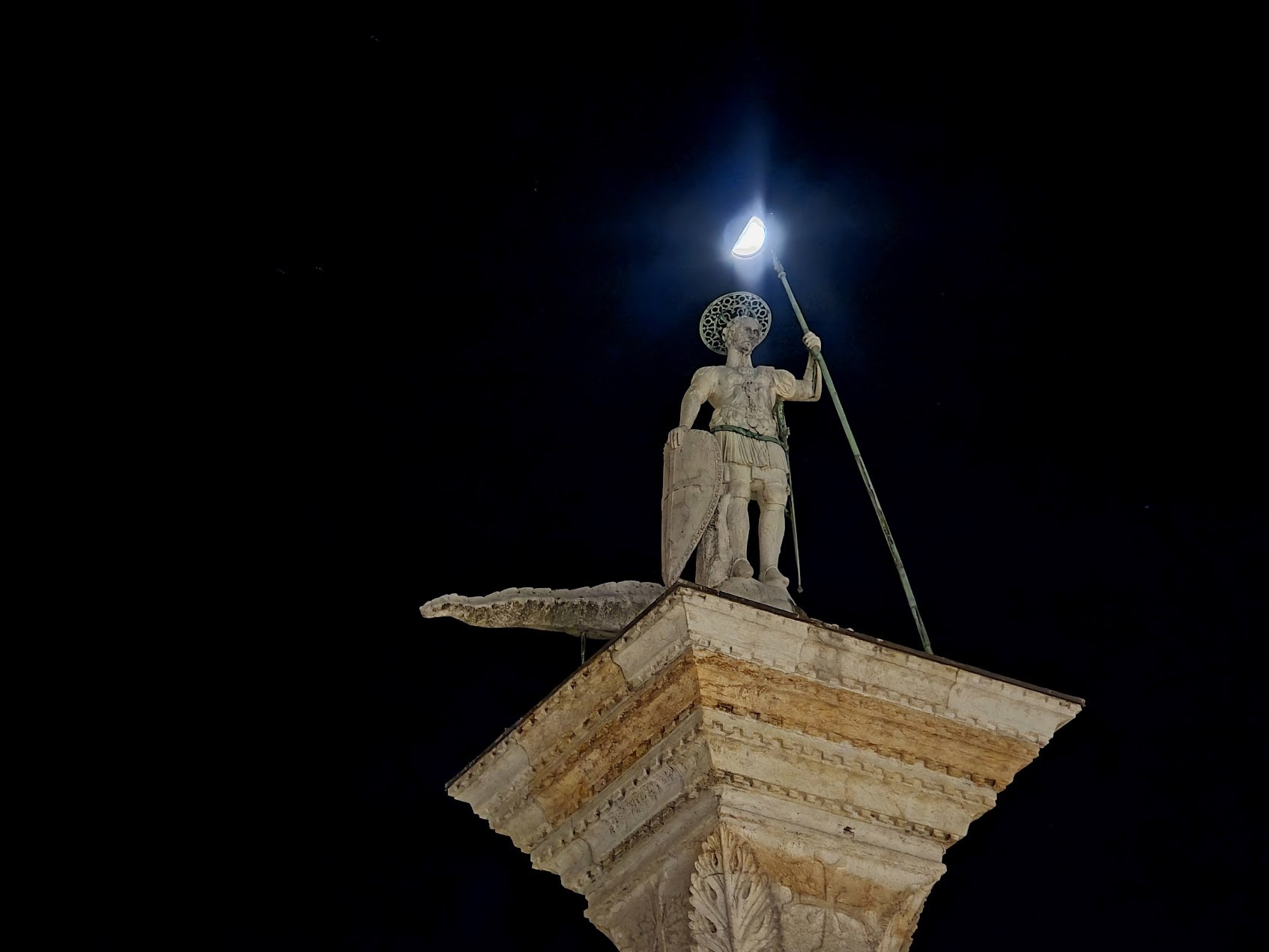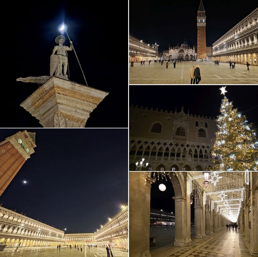 Die Säule mit San Teodoro im Mondlicht, der weit offene Platz, die Arkaden mit ihren endlosen Lichtreihen… alles hat Raum zum Atmen. Kein Gedränge, kein Krach, sondern diese fast unwirkliche Adventsruhe, die man nur spätabends oder sehr frühmorgens bekommt. 🌟
