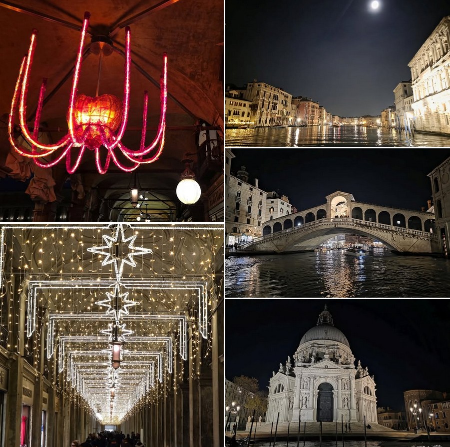 Rialto im Nachtlicht 🌉, Santa Maria della Salute wie eine ruhige Wächterin ⛪, und diese Weihnachtsinstallation – fast sakral, fast kitschig, aber genau auf der richtigen Seite der Linie 😌✨
