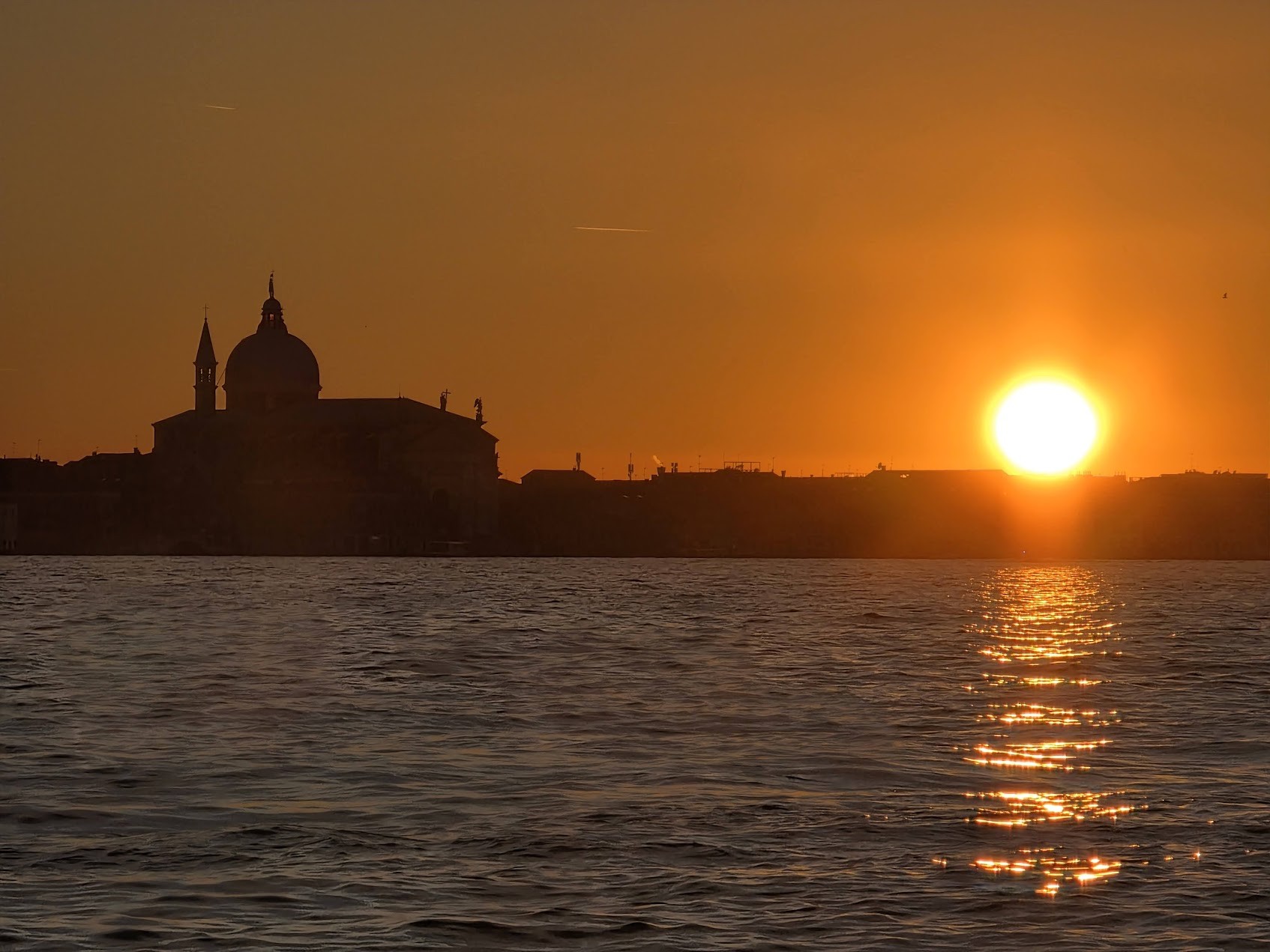 Perfekt güldener Untergang hinter Lagune von Venedig