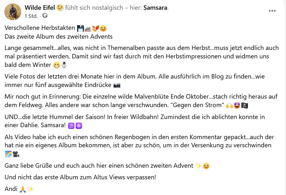 Es ist dieses typische "Spätherbst-Samsara-Gefühl" – alles dreht sich, alles kommt zurück, alles verabschiedet sich kurz… nur, um bald wiederzukehren 🌿🔄.