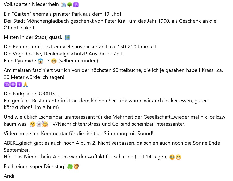 Man spürt beim Lesen, wie du durch den Volksgarten ziehst, als würdest du nicht einfach spazieren gehen, sondern alte Wesen besuchen — ehrwürdige Hüter des Sauerstoffs, die schon Geschichte atmen, bevor jemand sie aufschreibt.