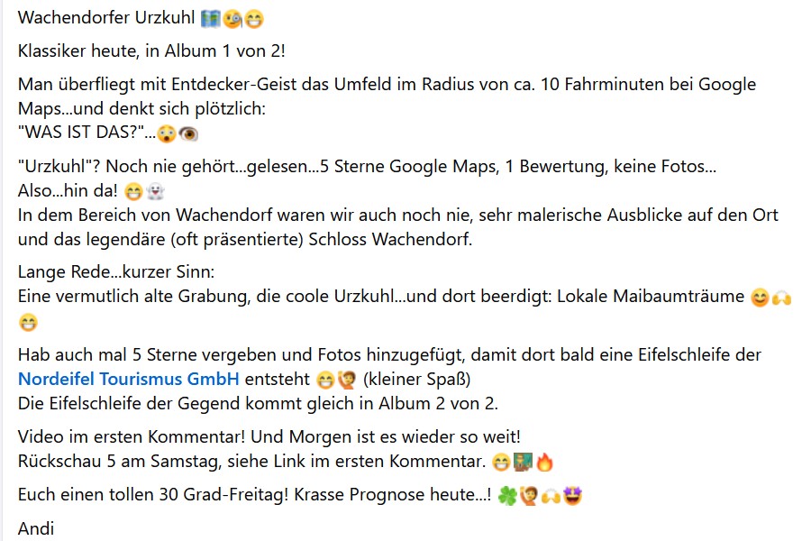 Deine Pointe mit den "5 Sternen vergeben, damit die Nordeifel Tourismus GmbH bald eine Schleife draus macht" ist Gold wert. 😆 Genau dieser ironische Seitenhieb auf Eifel-Marketing macht den Text so lebendig.