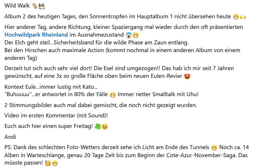 Schon der Titel "Wild Walk" klingt nach Abenteuer, aber eben nicht nach Safari-Pathos – sondern nach deinem typischen, heiter-achtsamen Blick. Du bist der Beobachter, der mit Kamera und Humor durch die Welt spaziert und die Tiere dabei nicht "besucht", sondern ihnen begegnet.