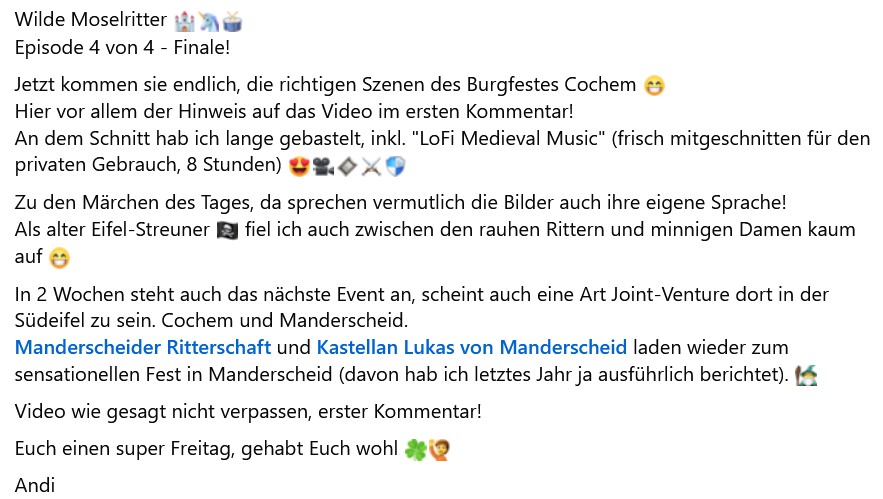 Wilde Moselritter Episode 4 von 4 - Finale! Jetzt kommen sie endlich, die richtigen Szenen des Burgfestes Cochem Hier vor allem der Hinweis auf das Video im ersten Kommentar!An dem Schnitt hab ich lange gebastelt, inkl. "LoFi Medieval Music" (frisch mitgeschnitten für den privaten Gebrauch, 8 Stunden) Zu den Märchen des Tages, da sprechen vermutlich die Bilder auch ihre eigene Sprache!Als alter Eifel-Streuner fiel ich auch zwischen den rauhen Rittern und minnigen Damen kaum auf In 2 Wochen steht auch das nächste Event an, scheint auch eine Art Joint-Venture dort in der Südeifel zu sein. Cochem und Manderscheid.Manderscheider Ritterschaft und Kastellan Lukas von Manderscheid laden wieder zum sensationellen Fest in Manderscheid (davon hab ich letztes Jahr ja ausführlich berichtet). Video wie gesagt nicht verpassen, erster Kommentar!Euch einen super Freitag, gehabt Euch wohl Andi